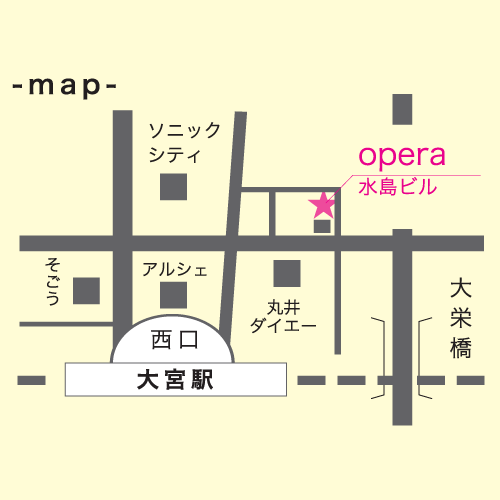 大宮駅西口をでて、アルシェとダイエーの間の道をはいって最初の交差点を右に曲がって、ファミリーマート、JACKのある交差点を左にまがった左側の手打ちうどん屋さんの2階になります。
